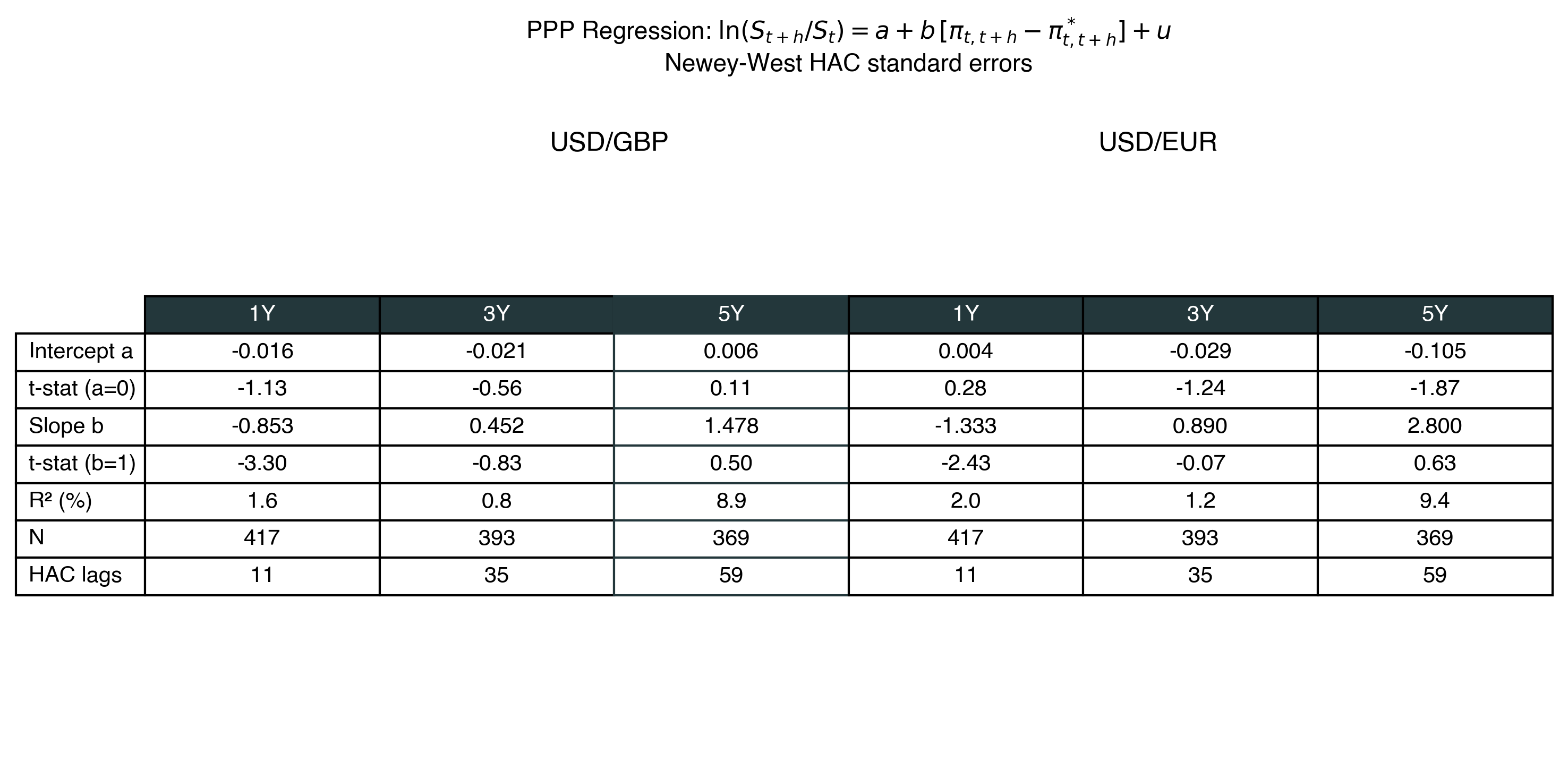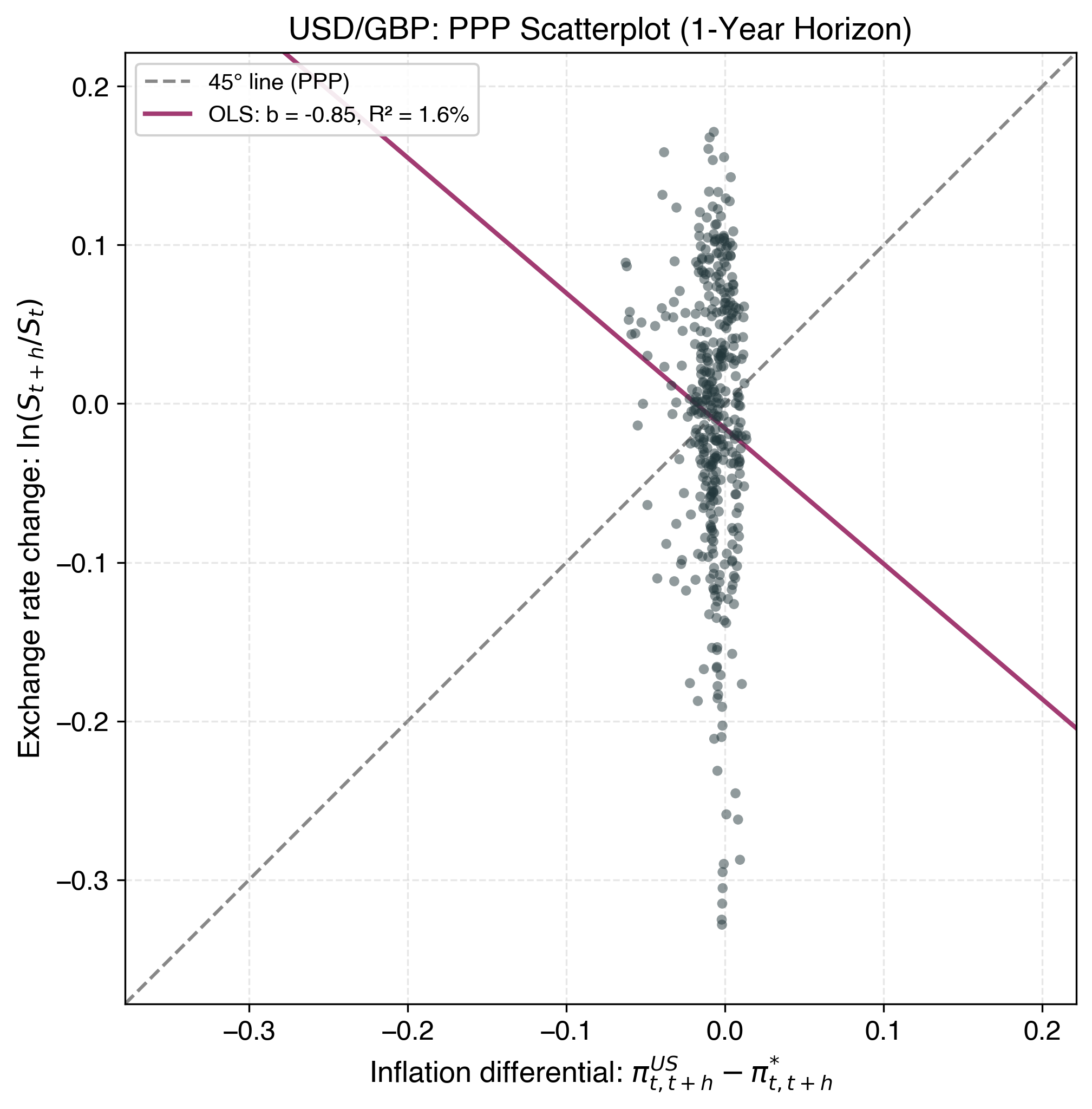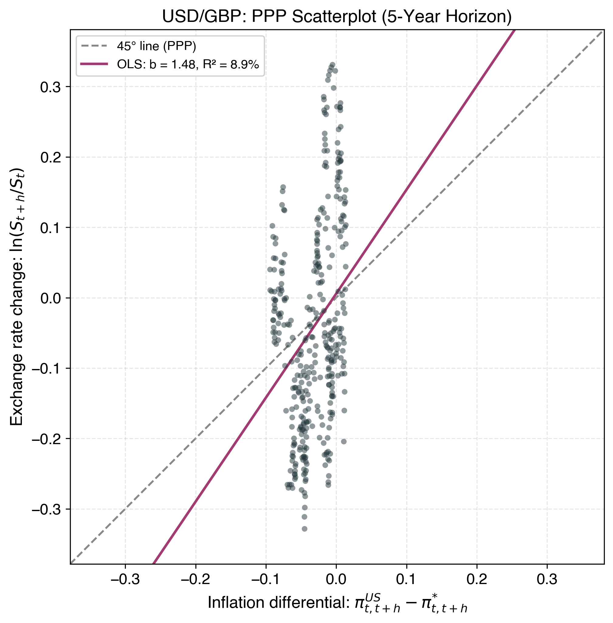 Short horizon (1Y): \(R^2 \approx 0\), slope far from 1 \(\rightarrow\) PPP has no predictive power