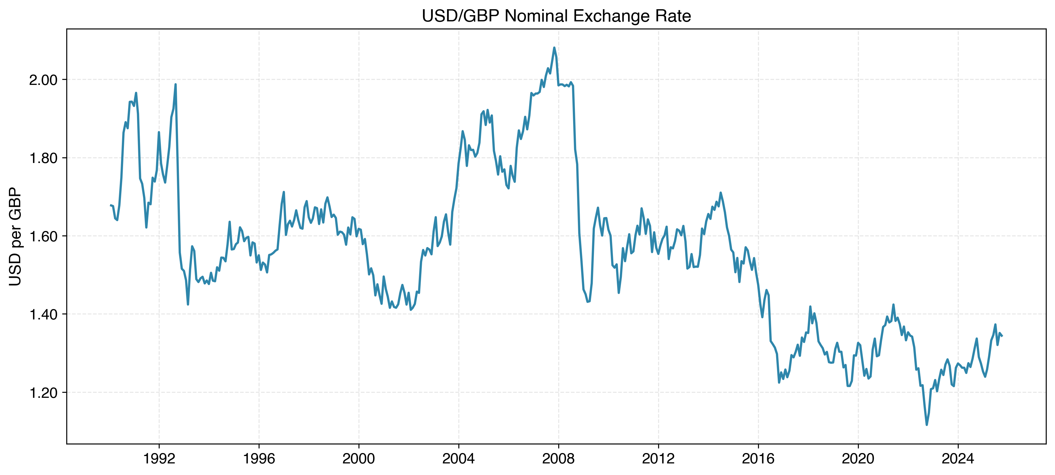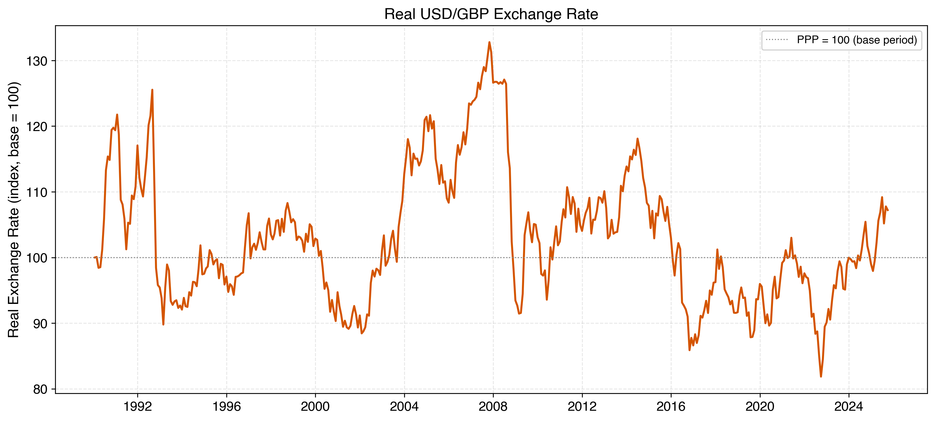 Real USD/GBP = \(S_t \cdot P^{UK}_t / P^{US}_t\), indexed to 100 at start of sample.