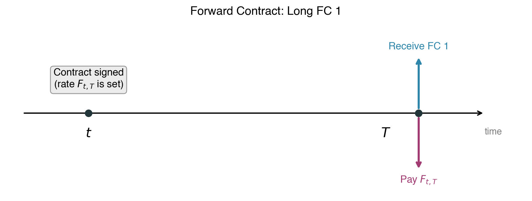 At \(t+1\), value a forward initiated at \(t\) (maturity \(T\), rate \(F_{t,T}\)) to buy FC 1.