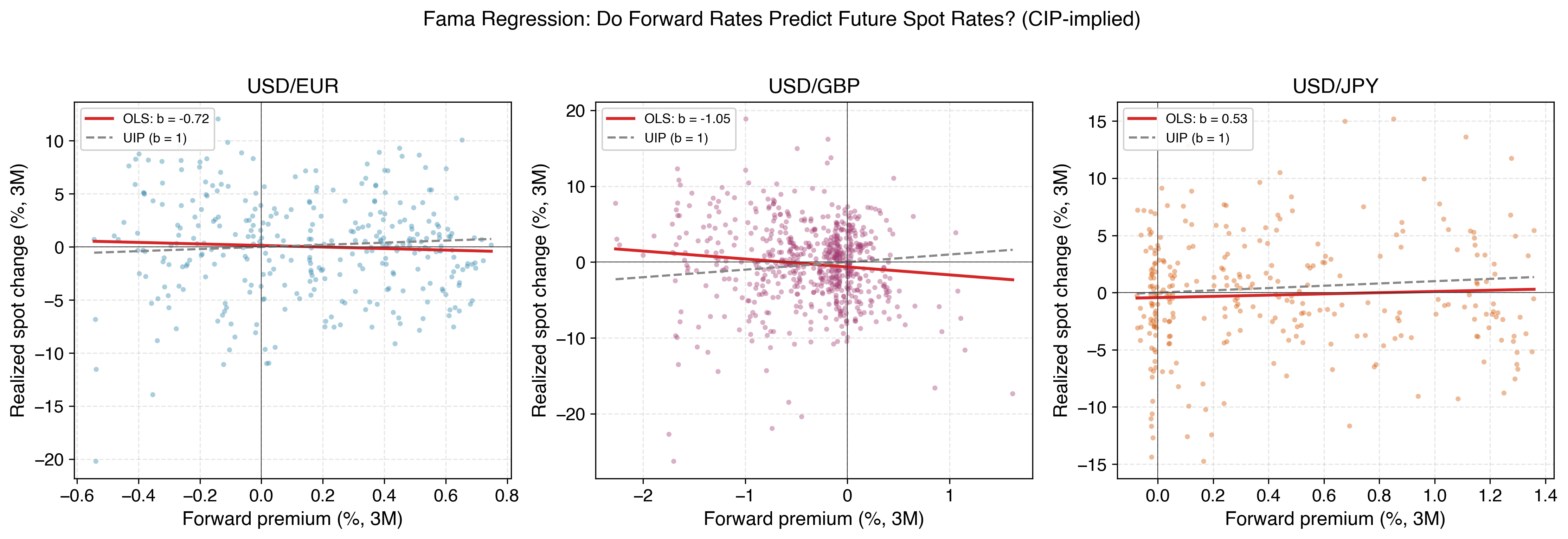 Implication: An investor who borrows in low-rate currencies and invests in high-rate currencies earns positive excess returns on average. This is the carry trade — and it works precisely because UIP fails.