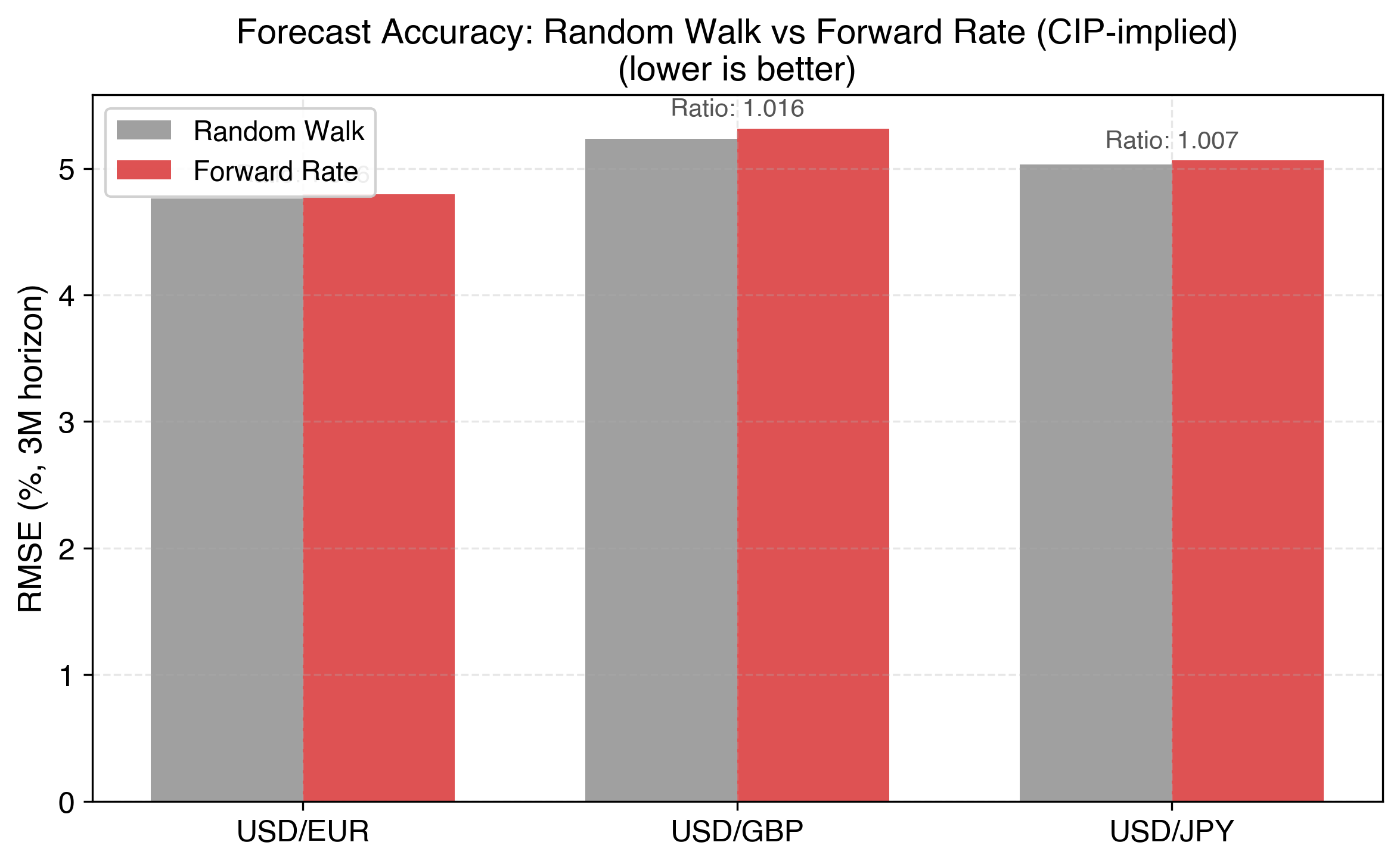 3M forecast horizon. Ratio < 1 means the forward rate beats the random walk.